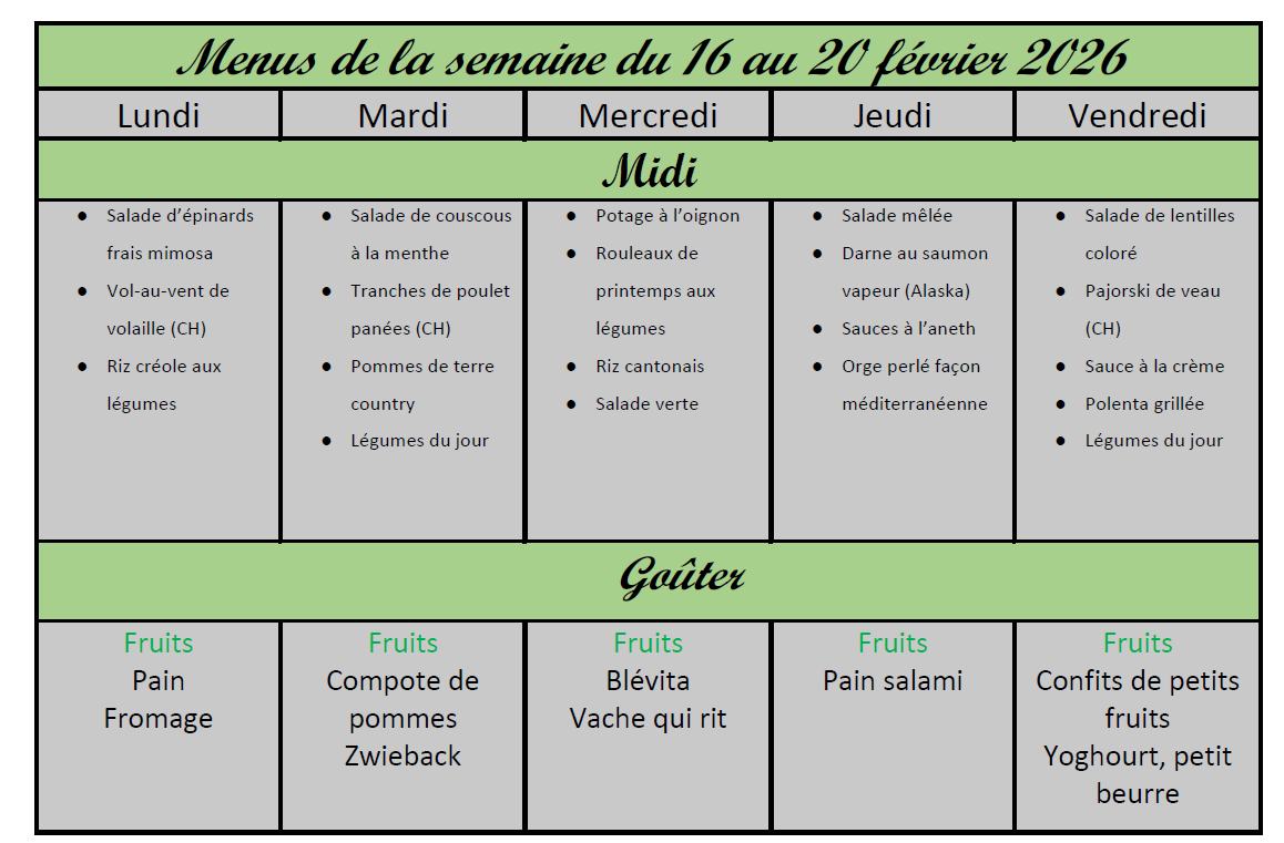 Menus du 16 au 20 février 2026